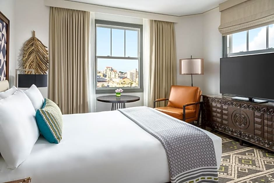 This standard king room features large windows with natural light flowing through. It is filled is filled with soothing colors and patterns with a comfortable work area. The bathroom is highlighted by a rejuvenating glass enclosed shower or tub. Room includes a 50-inch TV, WiFi, bath amenities, guest bathrobes, an in-room safe, ironing facilities and a mini refrigerator.